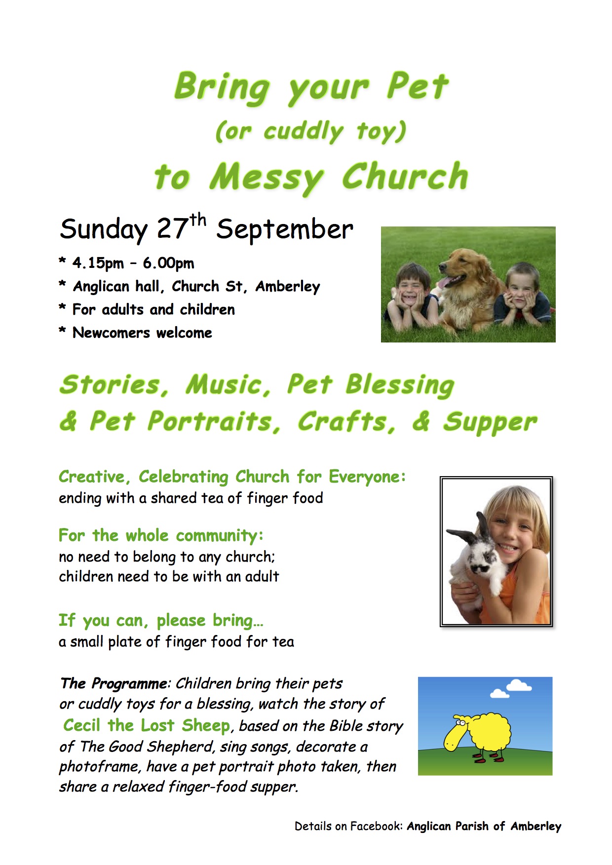 Messy Church is a fresh expression of what church is and can be. It’s open to the whole community, not only regular church-goers and Anglicans, and it’s not on a Sunday morning. PLEASE NOTE: it’s also not a requirement to be accompanied by children. So, adults and children, come and join us in Amberley — and bring a friend or neighbour.